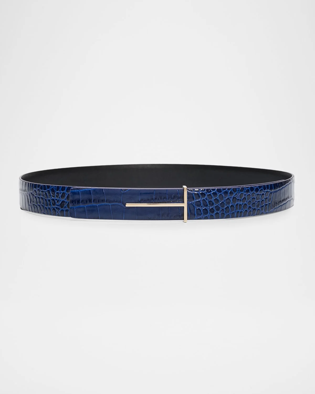 TOM FORD leather belt showcases a croc-embossed texture on one side and a polished gold-tone T buckle. Approx. 1"W Buckle closure Adjustable fit Leather Made in Italy