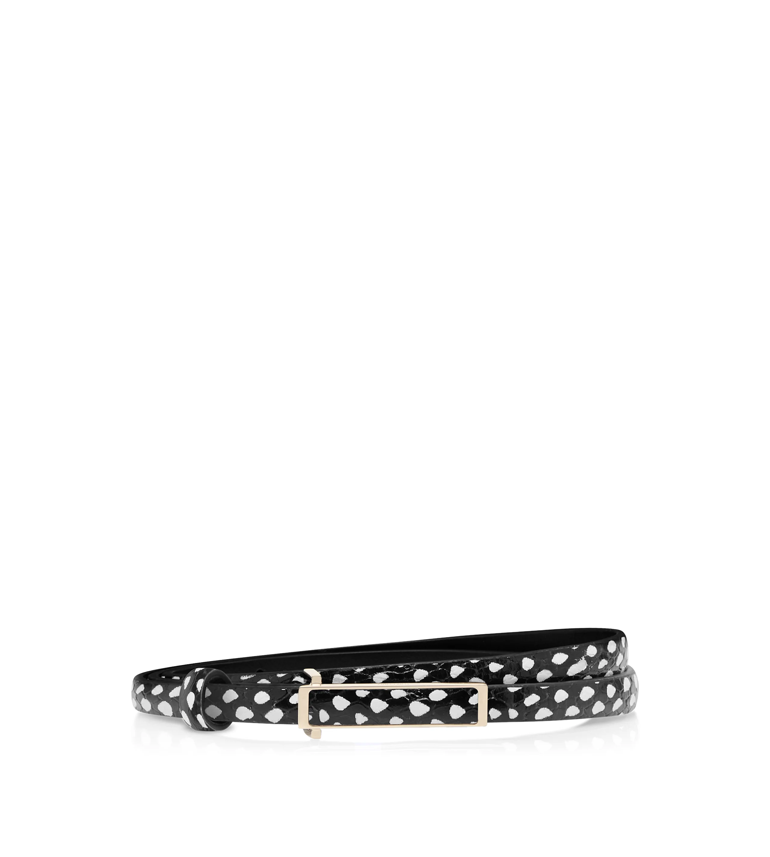 PRODUCT NO: WB326-LCL610P The TOM FORD leather insert belt is crafted in snakeskin-effect printed calf leather with an elongated metal buckle. Available from 60 to 105cm in a 10mm width, with nickel-free brass hardware. Composition: 100% calfskin Made in Italy