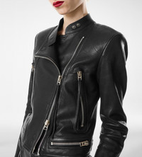 PRODUCT NO: CSL788-LEX402 Cut from semi shiny printed calf leather this pencil skirt channels TOM FORD’s sculptural precision. High waisted and falling just below the knee, it is fitted through a straight side line, enhanced by a self leather peplum facing that sharpens the silhouette. Raw cut, hand painted edges reveal artisanal finishing, while front slashed cut in pockets and double vents — at both front and back — are secured with handmade tacks. Belt loops, a side invisible zip with metal hook and eye closure, and a fully lined interior complete this refined leather statement piece. Unveiled on the runway, this look is part of Haider Ackermann’s first Winter 2025 Fashion Show. Composition: 100% calf leather with details in 100% lamb leather and lining made of 73% acrylic, 27% silk Made in Italy