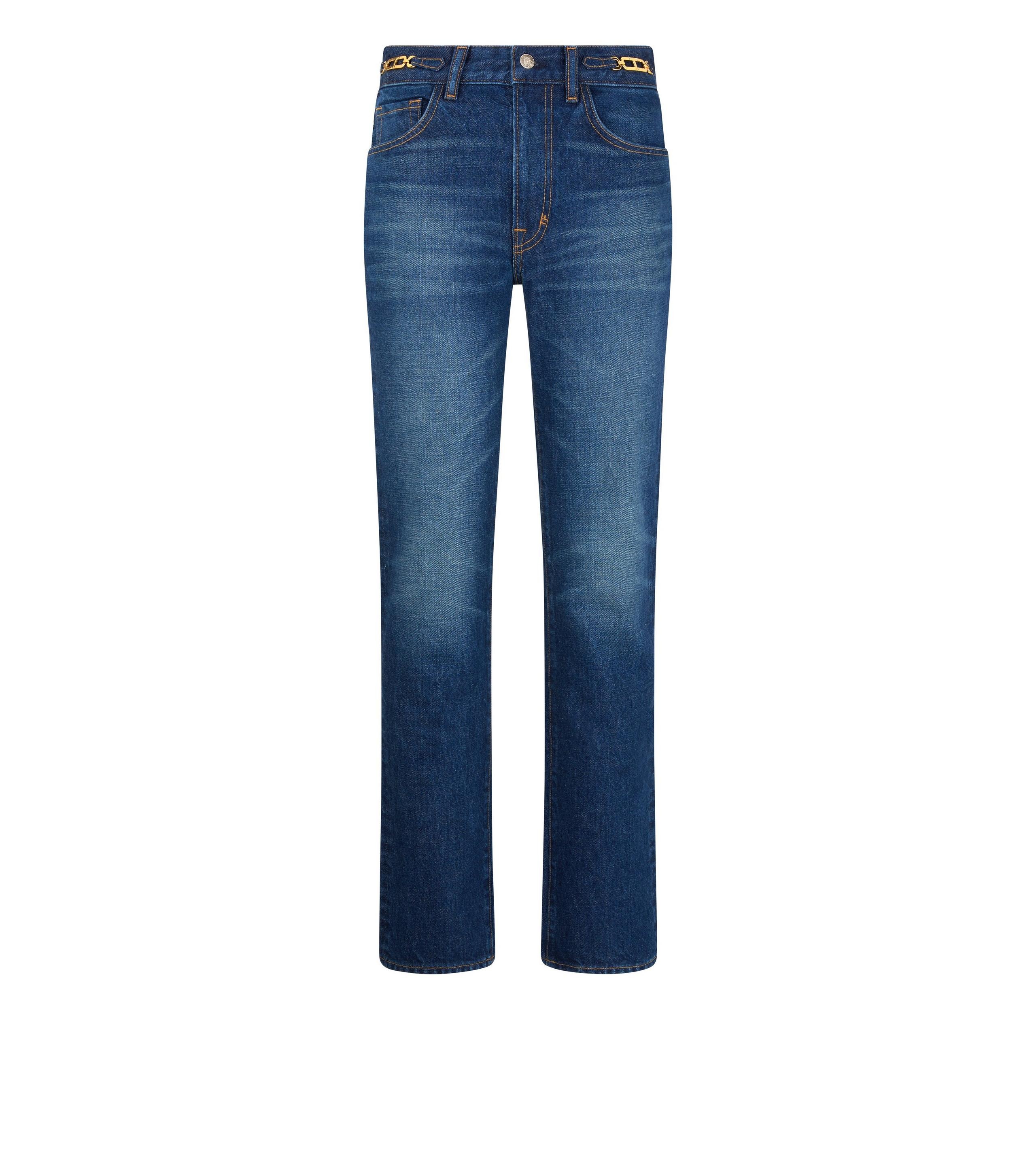 - STRAIGHT FIT PANTS - 5 POCKETS STYLE - TOM FORD SIGNATURE TUCK BUTTON CLOSURE AND RIVETS - WHITNEY HARDWARE DETAIL AT WAISTBAND - TOM FORD EMBOSSED ALCANTARA LABEL ON BACK POCKET - ANTIQUE SILVER, COPPER AND AMBER GOLD HARDWARE - CRAFTED IN STONE WASHED DENIM - 100% COTTON - MADE IN USA