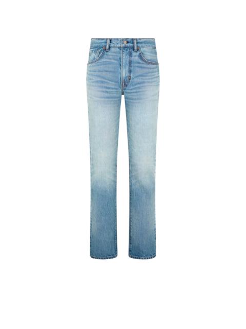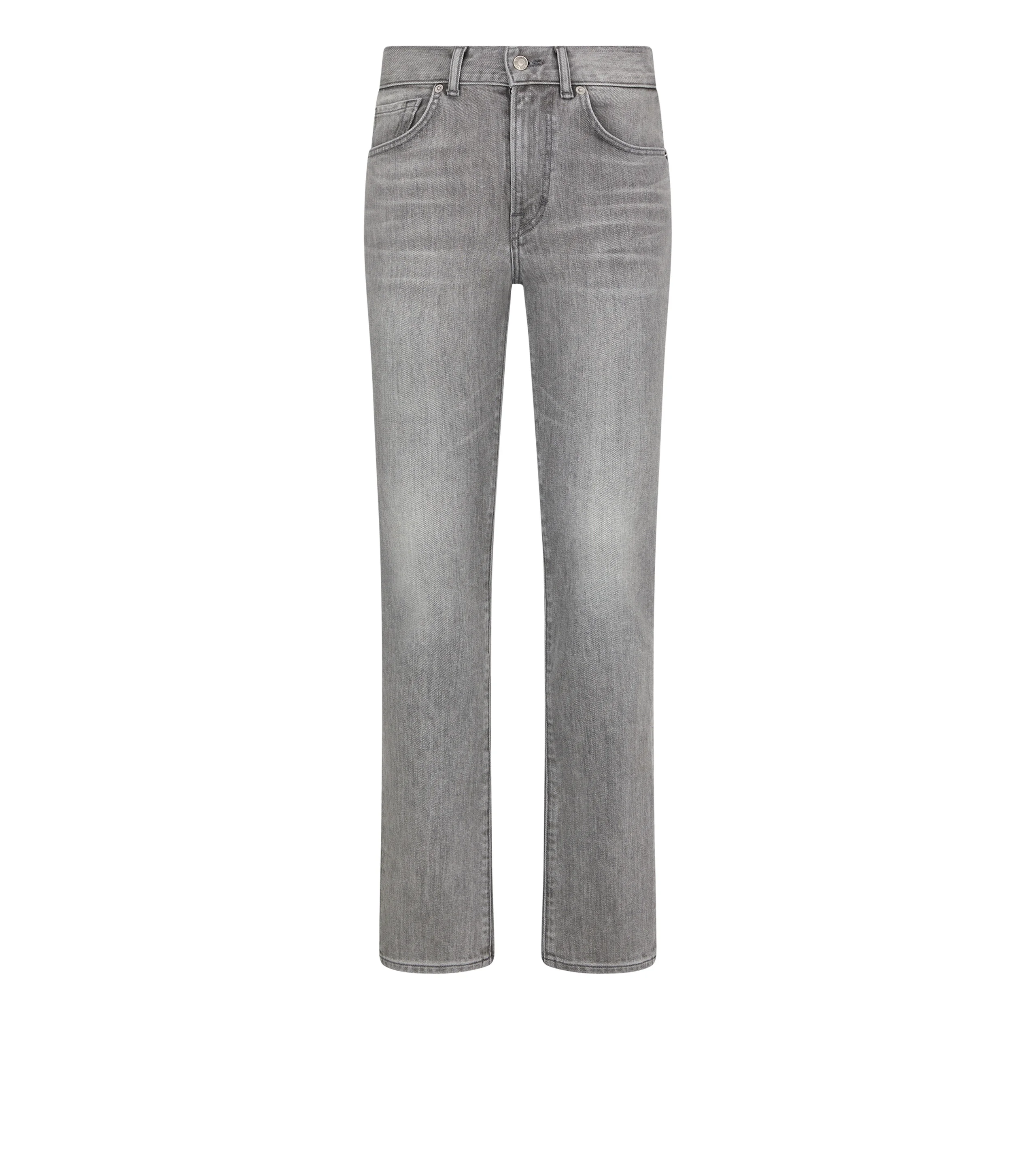 - STRAIGHT FIT PANTS - 5 POCKETS STYLE - TOM FORD SIGNATURE TUCK BUTTON CLOSURE AND RIVETS - TOM FORD EMBOSSED ALCANTARA LABEL ON BACK WAISTBAND - ANTIQUE SILVER HARDWARE - MADE IN USA - CRAFTED IN JAPANESE STONE WASHED COMFORT DENIM