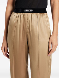 straight-leg satin trousers Highlights - Beige - Silk blend - Stretch-design - Satin weave - Lightweight construction - Logo patch to the front - Two side slash pockets - Front exposed-seam detailing - Full-length - Two rear patch pockets - Straight leg - Elasticated waistband Made in Italy Composition Silk 94%, Elastane 6% SIZE & FIT Measurement FRONT RISE 12.59 in(32 cm) WAIST 31.49 in(80 cm) HIPS 43.3 in(110 cm) Washing instructions Read Manufacturer Guidelines