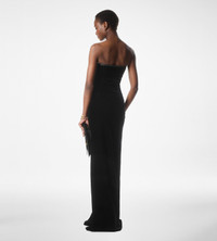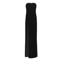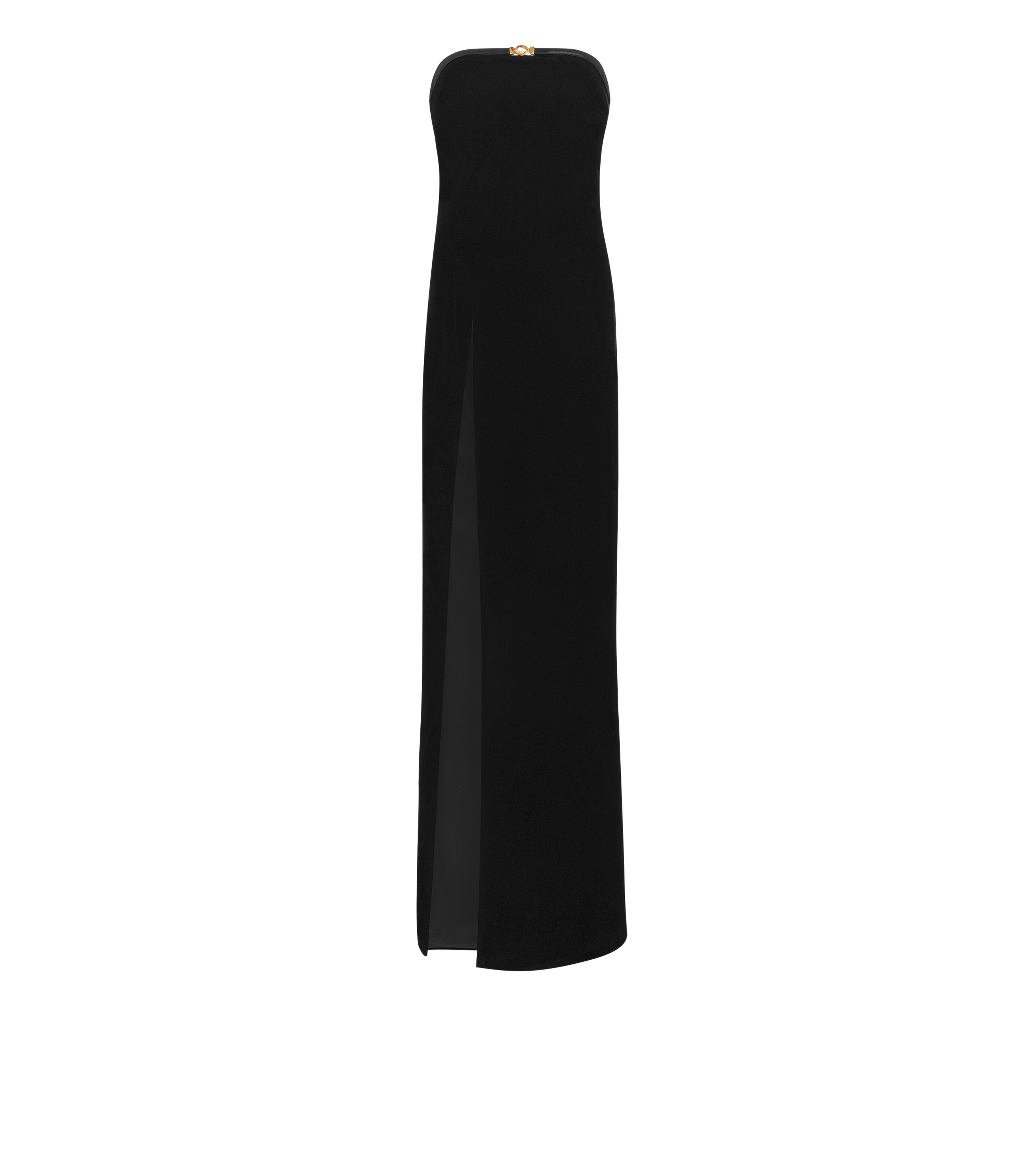 - STRAPLESS EVENING DRESS - FULL LENGTH - BONDED LEATHER TAPE ALONG CHEST WITH INFINITY HARDWARE DETAIL - FRONT DEEP SIDE SLIT - INVISIBLE ZIP - AMBER VINTAGE GOLD METAL HARDWARE - FULLY LINED - CRAFTED IN STRETCH VELVET - 66% VISCOSE 31% CUPRO 3% ELASTANE