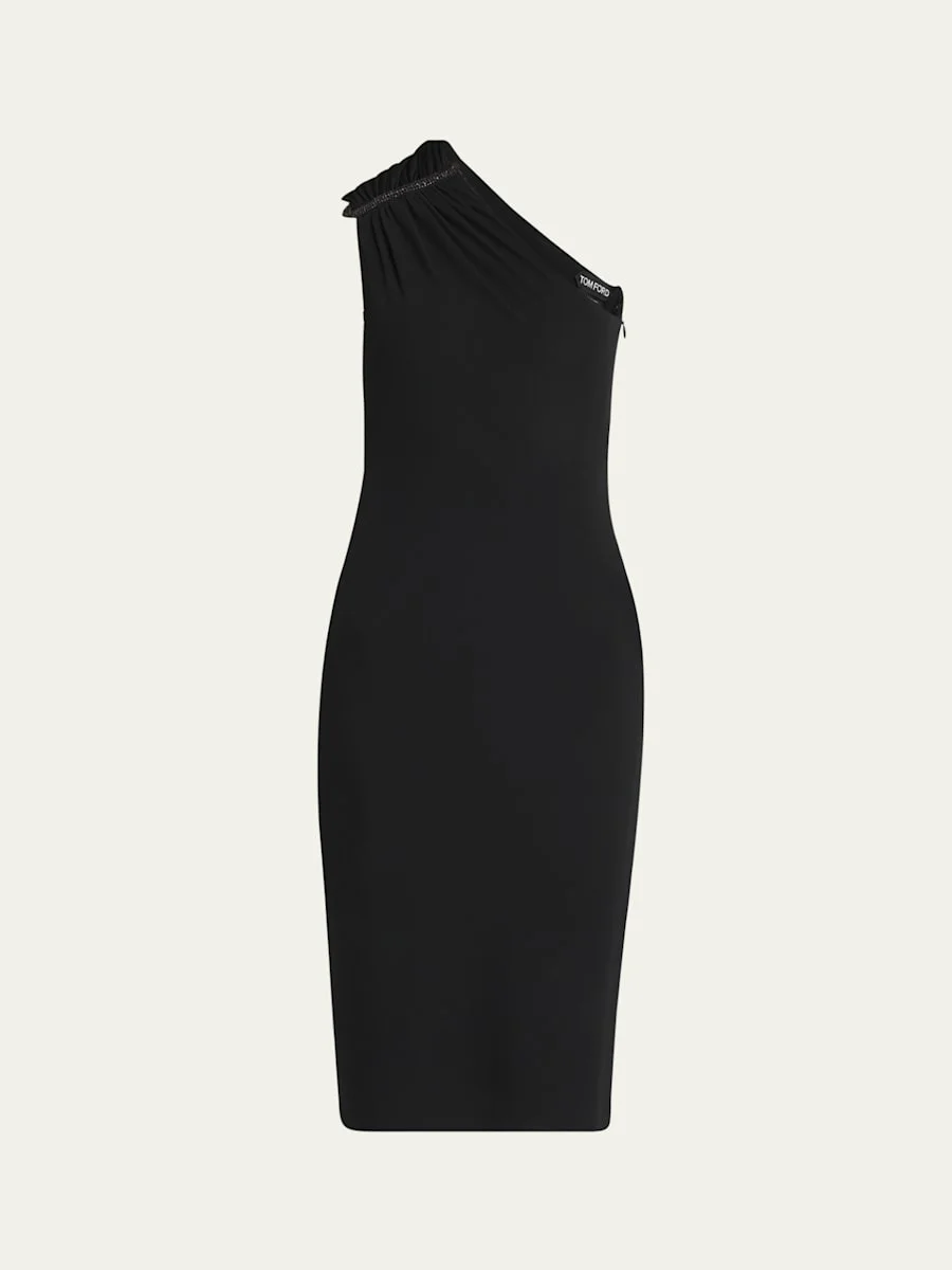 TOM FORD dress featuring a strass embellished and ruched shoulder detail One-shoulder neckline Sleeveless Body-conscious silhouette Knee length Invisible side zip Viscose/glass/brass Made in Italy Online Inquiries: BGS21_BA4LB| Store Inquiries: #5034284