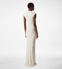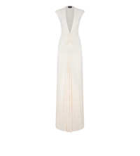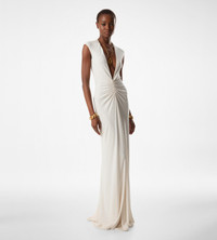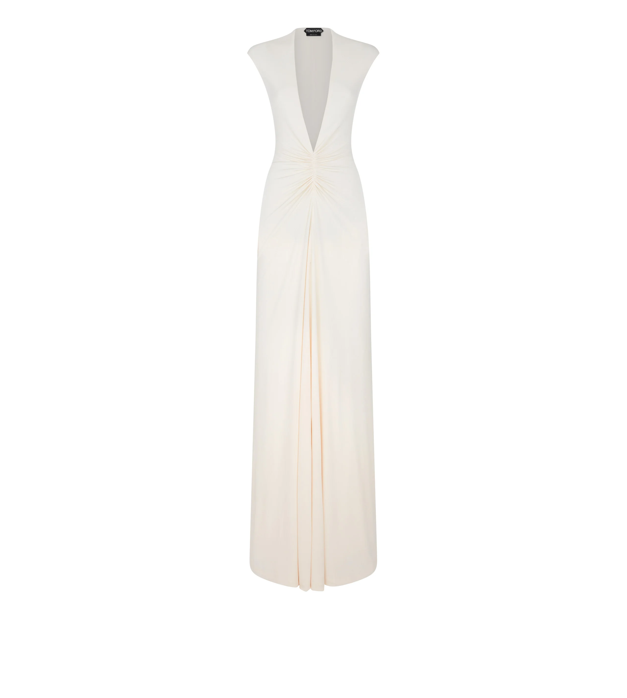 - CAP SLEEVE DEEP V-NECK EVENING DRESS - FULL LENGTH - CENTRE FRONT RUCHING DETAIL - CENTRE FRONT SLIT - FULLY LINED - CRAFTED IN STRETCH SABLE' JERSEY - 83% VISCOSE 11% NYLON 6% ELASTANE