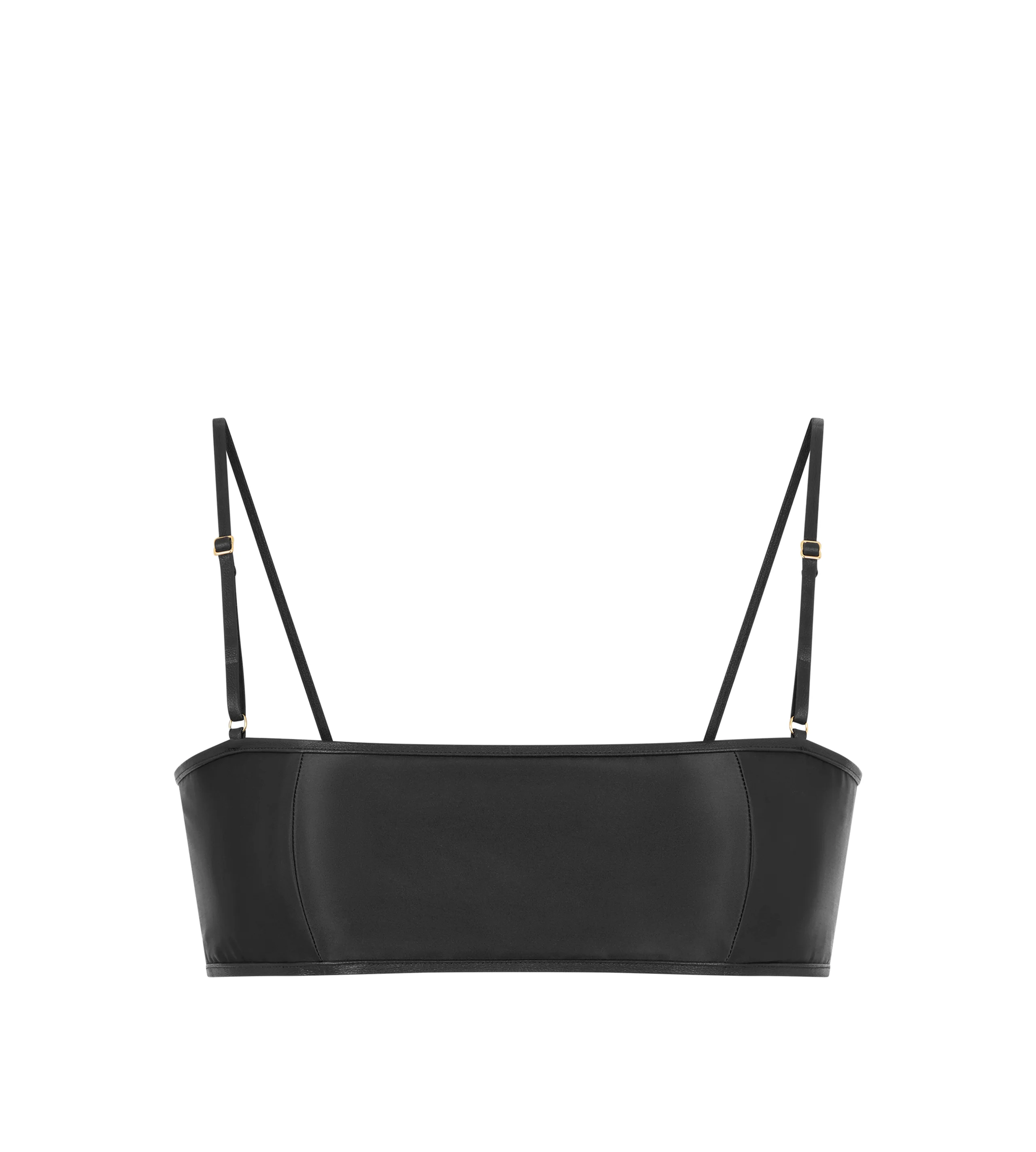 PRODUCT NO: BR0052-FAX1753 The TOM FORD bandeau bralette is crafted in stretch satin with adjustable straps and a double strap closure at the back finished with TF signature buckles in leather. Composition: 92% polyester, 8% elastane, trim in lamb leather Made in Italy
