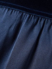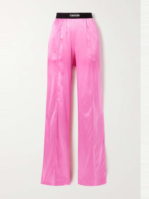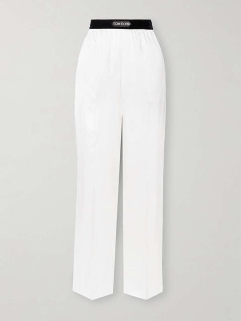 Expertly tailored in Italy, TOM FORD's pajama-style pants are suitable for dinners and daytime looks alike. They're made from lustrous silk-satin blended with stretch and have an elasticated, logo-detailed velvet waistband. Balance the relaxed legs with heeled sandals. Size & Fit - Fits true to size, take your normal size - High-rise, cut for a relaxed fit - Elasticated at the waist for a comfortable fit - Lightweight, stretchy fabric - Model is 180cm/ 5’11” and is wearing a size Small Details & Care - Navy stretch-silk satin, black velvet - Pull on - 94% silk, 6% elastane; trim: 90% polyamide, 10% elastane - Dry clean