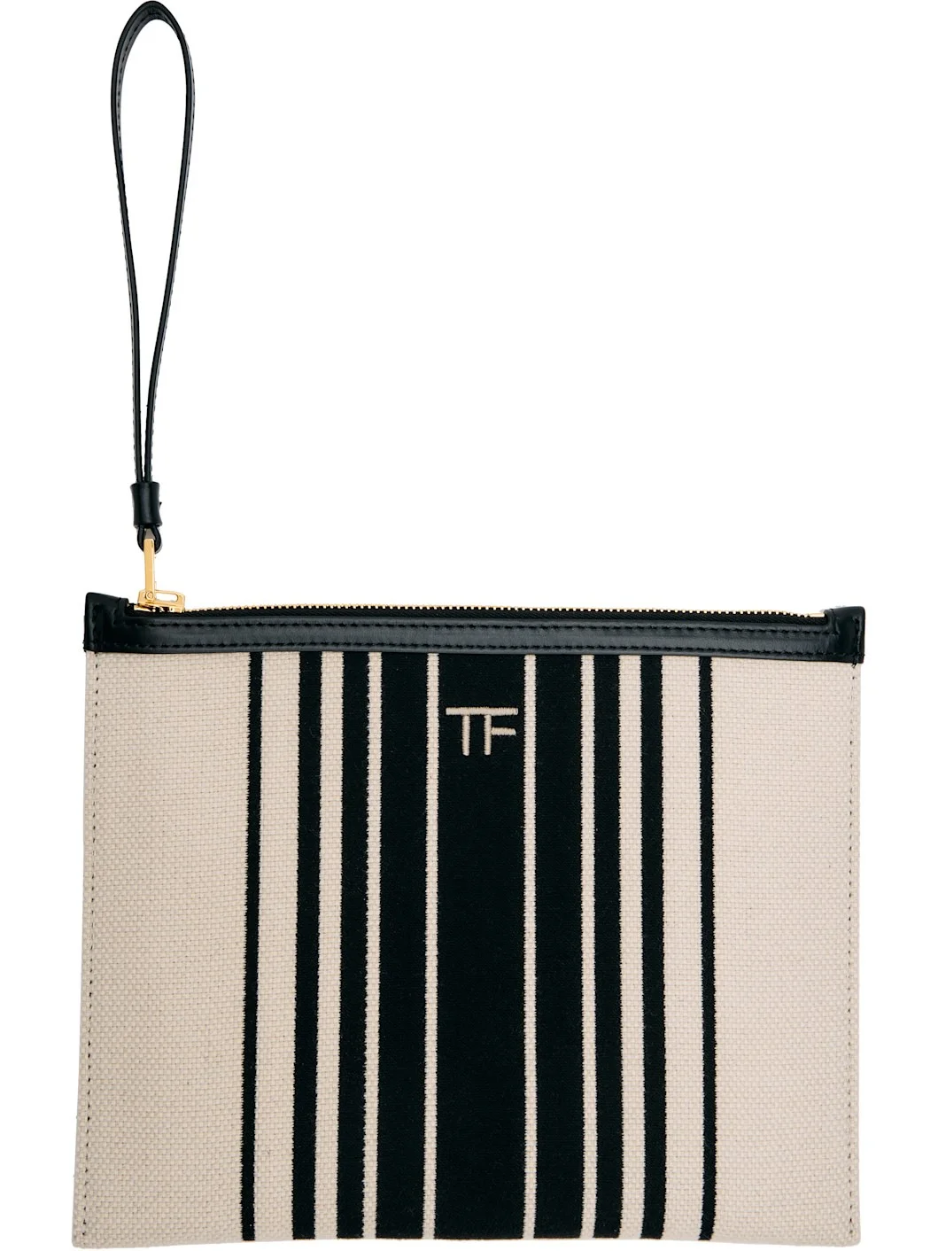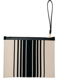 Cotton hopsack and buffed calfskin pouch. · Jacquard stripes throughout · Logo embroidered at face · Wristlet at zip closure · Canvas lining · Gold-tone hardware · H7.25" x W9.5" Supplier color: Natural/Black Cotton, calfskin. Made in Italy 252076F045000