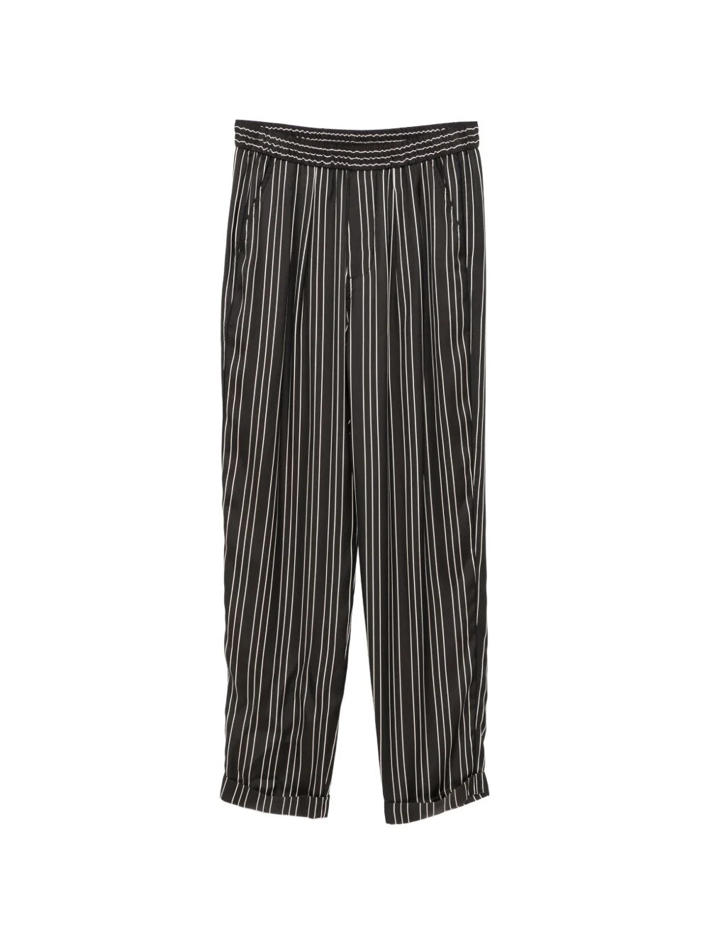 striped trousers Highlights - Black - Striped pattern - Two side slash pockets - Two rear patch pockets - Elasticated waistband Made in Italy Composition Silk 100% Washing instructions Do Not Wash/Do Not Dry Clean
