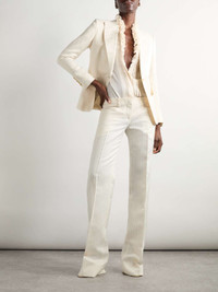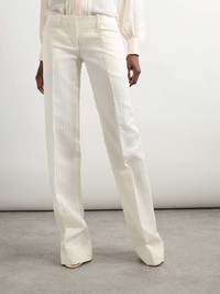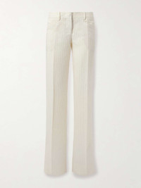 EDITORS'NOTES TOM FORD's tailoring is so good as it borrows from custom menswear techniques but with total consideration of the feminine form. These pants are cut from wool-blend that's woven with a touch of silk for smoothness and patterned with metallic pinstripes for a lengthening effect. They look even more striking when paired with the coordinating jacket. Large to size. See Size & Fit notes. SIZE & FIT Model measurements: - Fits large to size, take one size smaller than normal - Low-rise, designed for a straight-leg fit - Lightweight, non-stretchy fabric - Model is 177cm/ 5'10", normally wears an IT 38 and is wearing an IT 36 - Bust: 79cm/ 31" - Waist: 61cm/ 24" - Hip: 89cm/ 35" DETAILS & CARE - White and silver wool-blend - Concealed button and zip fastening at front - 78% wool, 20% silk, 1% viscose, 1% metallic polyester - Dry clean