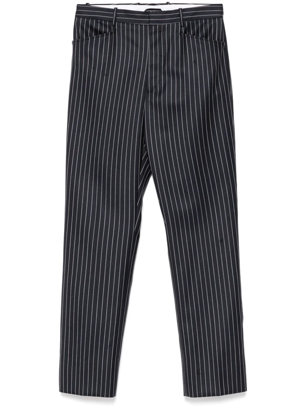 striped trousers Highlights - Navy blue - Concealed front button, hook and zip fastening - Belt loops - Two rear jetted pockets Made in Italy Composition Lining: Cupro 59%, Silk 41% Outer: Wool 100% SIZE & FIT Model measurements Height 5 ft 10 in(1.78 m) Bust/Chest 24.4 in(62 cm) Hips 35.43 in(90 cm) Waist 31.88 in(81 cm) FittingInformation Designed with a flared hem, these trousers allow for a close fit at the waist with a slim fit over the leg and widening towards the hem Made from a midweight non-stretch fabric