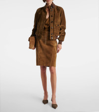 Tom Ford’s tailoring showcases meticulous attention to detail with a dose of high-octane glamour. This chic pencil skirt is entirely crafted from supple suede, and features a high belt detail with silver-toned hardware for a modern touch. Product Details - Material: 100% lamb leather (suede) - Care instructions: specialist clean - Made in Italy - Designer color name: Pecan - Item color: brown - Lining: 73% acetate, 27% silk - Hardware color: silver - Closure: partially zipped front, snap-buttoned fastenings - Adjustable tabs at the waist - Short vent - Belt loops - Fully lined - Includes: garment bag - Item number: P01053666 Size & Fit - True to size - Non-stretchy fabric - slit length 18cm-7" - The model seen in the picture is 178cm-5'10" and wearing a size IT 38