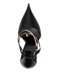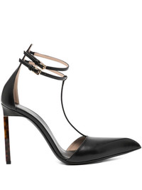 105mm T-strap pumps Highlights - Black - Adjustable strap to the rear - Pointed toe - Branded footbed Made in Italy Composition Lining: Leather 100% Outer: Leather 85%, glass 10%, Brass 5% Sole: Leather 100% SIZE & FIT Measurement HEEL 4.13 in(10.5 cm)