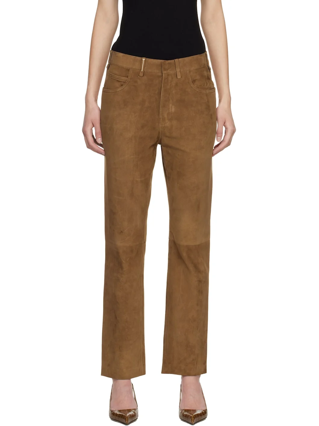 Lambskin suede pants. · Straight-leg · Logo hardware at waistband · Belt loops · Zip fly · Five-pocket styling · Full silk-blend satin lining Supplier color: Caramel Body: 100% lamb leather. Lining: 73% acetate, 27% silk. Made in Italy 261076F084000