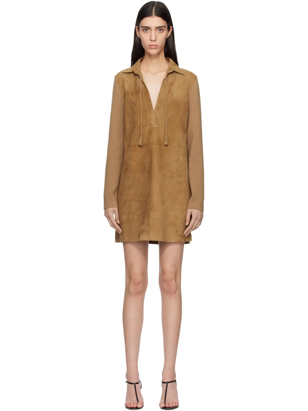 Paneled lambskin suede and knit wool minidress. · Braided drawstring with tassels at open spread collar · Plunging open placket · Darts at chest · Vented hem · Unlined Supplier color: Golden Brown Body 1: 100% lambskin. Body 2: 87% wool, 13% polyester. Made in Italy 261076F052001