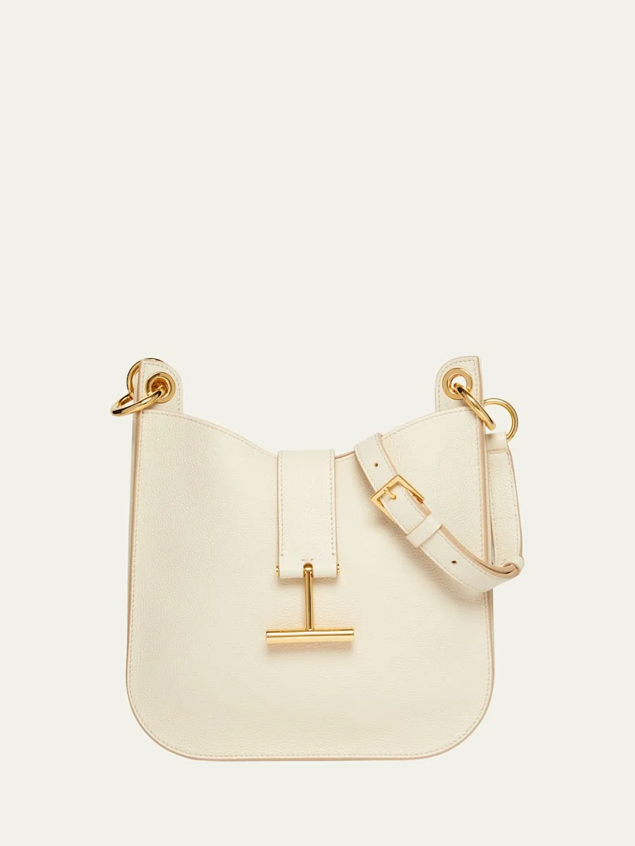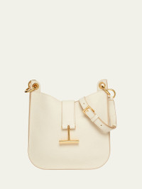 TOM FORD "Tara" crossbody bag in grain leather, faux leather (polyurethane), and brass Detachable, adjustable shoulder strap Detachable, adjustable crossbody strap Can be worn as a shoulder or crossbody bag Open top with center Tstrap magnetic closure Interior, one zip pocket Lining: Polyurethane Approx. 9.8"H x 9.8"W x 0.8"D Item Weight (Lbs.): 1.5 Made in Italy