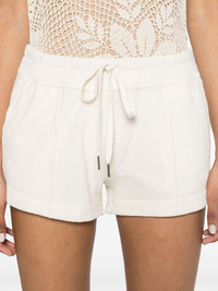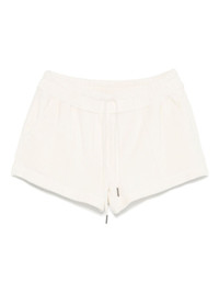 terrycloth shorts Highlights - Light beige - Elasticated drawstring waistband - Two diagonal pockets to the sides - Two rear welt pockets - Raised seam detail Imported Composition Cotton 82%, Polyamide 18% SIZE & FIT Model measurements Height 5 ft 10 in(1.78 m) Bust/Chest 32.67 in(83 cm) Hips 35.43 in(90 cm) Waist 23.22 in(59 cm) FittingInformation Designed for a slim fit that sits just away from the body offering a close yet comfortable fit Adjust this piece’s waistband to your preference using the drawstring Made from a midweight non-stretch fabric