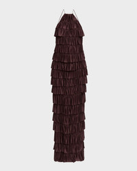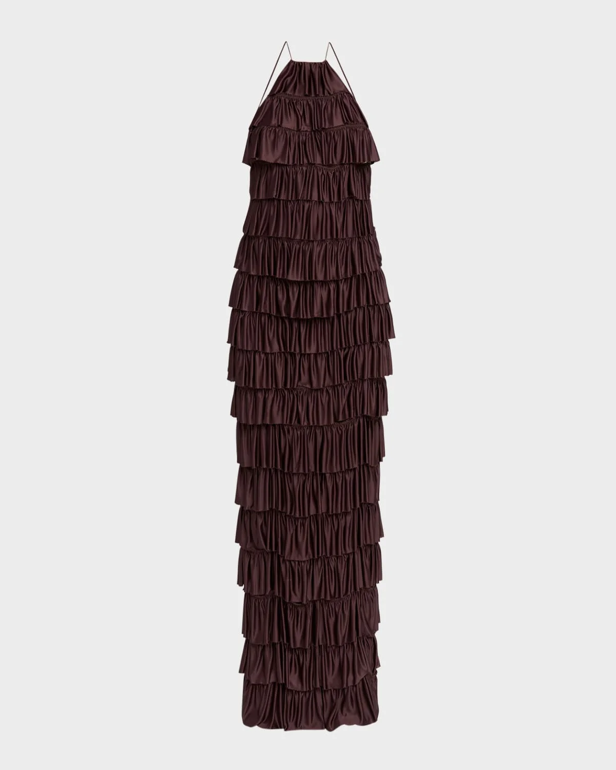 TOM FORD lustrous viscose jersey evening dress featuring tiered ruffles and a strappy open back Halter neckline Sleeveless Column silhouette Floor length Hidden closure Viscose Made in Italy