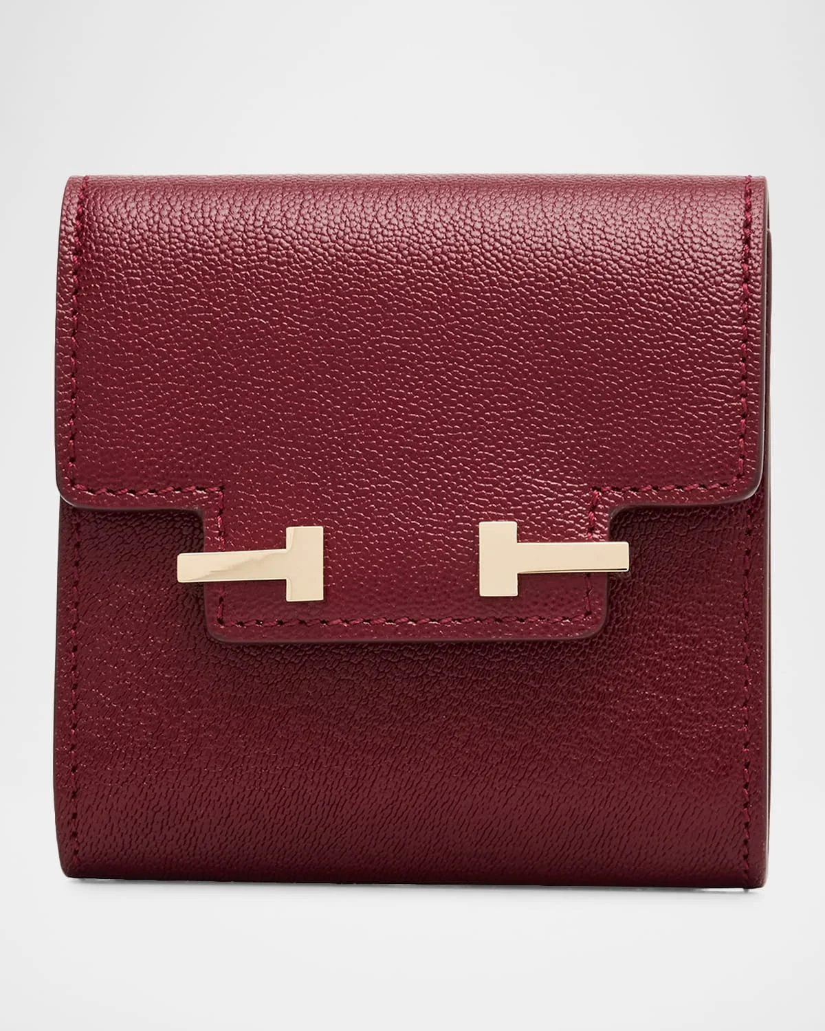 This compact wallet by TOM FORD is crafted from grained leather and finished with signature Double T hardware Flap top with snap closure One main compartment Made in Italy