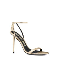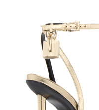 PRODUCT NO: W2272-LSP014P A bold TOM FORD naked sandal in laminated nappa leather, defined by a sharp pointed toe and signature padlock hardware. The iconic metal spike heel delivers sculptural impact and unmistakable attitude. Composition: 100% lambskin Lining: black leather , sole: leather Heel: 105 mm iconic metal spike heel Details: adjustable buckle ankle strap, engraved TOM FORD logo buckles Made in Italy