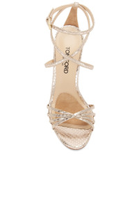 Details - Python-embossed calf leather upper with leather sole - Made in Italy - Adjustable ankle buckle closure - Leather lining - Almond toe - Open wedge - Approx 100mm/ 4 inch heel - Our Style No. TFOF-WZ114 - Manufacturer Style No. W3539-LCL129P