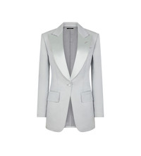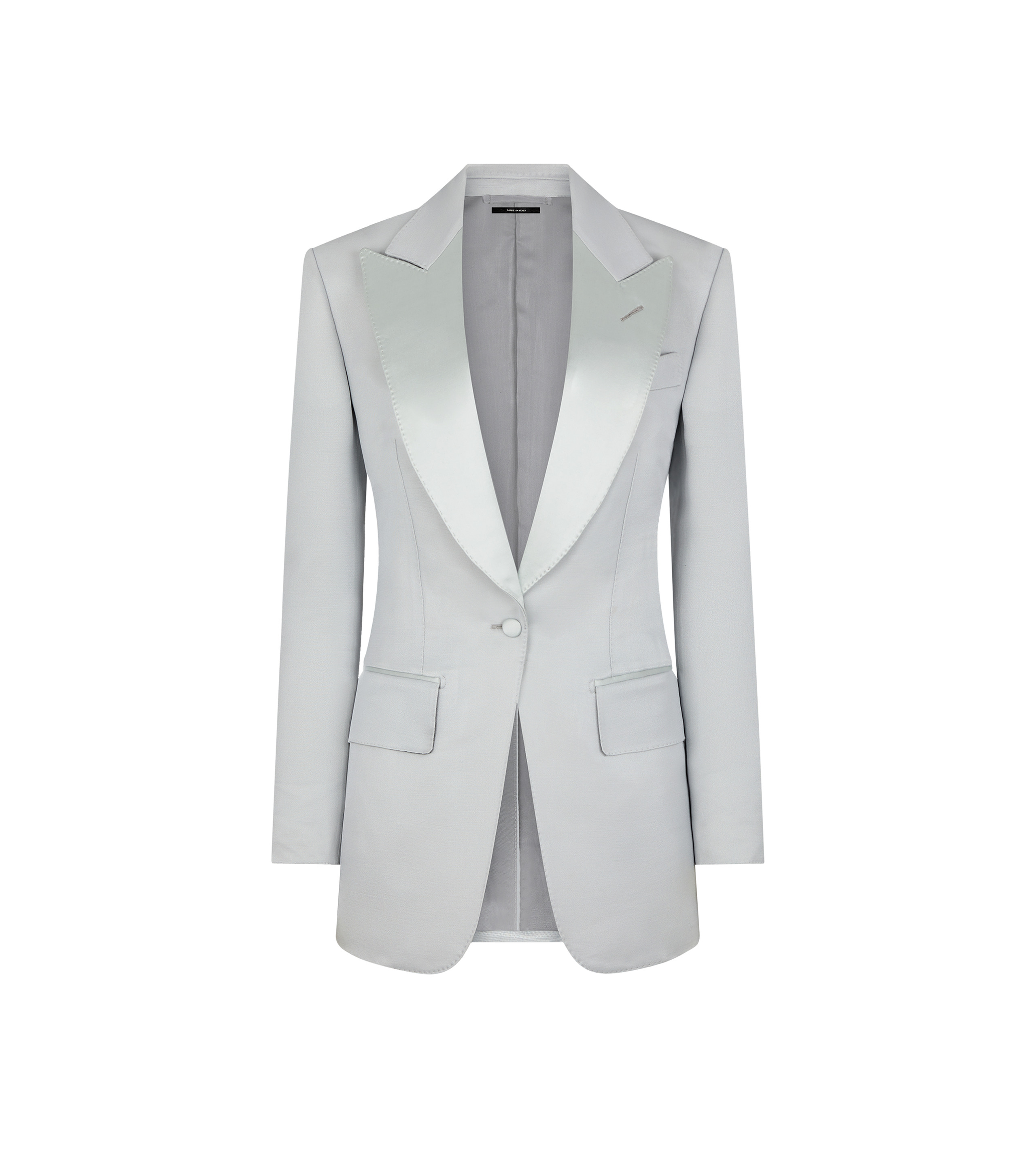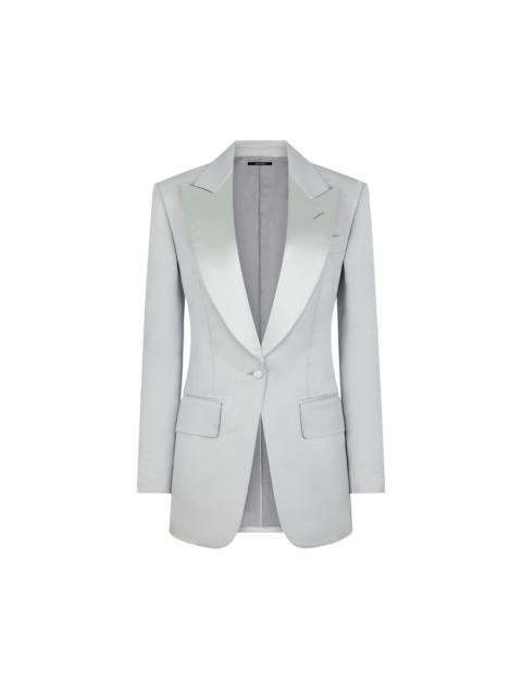- SINGLE BREASTED TUXEDO PEAK LAPEL JACKET - BARCHETTA CHEST POCKET - HAND-MADE LAPEL BUTTONHOLE - FLAP POCKETS - SATIN-TRIMMED DETAILING ON FRONT POCKETS AND LAPELS - 5 KISSING CUFF BUTTONS - TOM FORD DESIGNS FEATURE A LONGER FIRST FINAL BUTTONHOLE ON CUFF - WITH INTERNAL POCKETS - SINGLE VENT - COVERED BUTTONS - AMF STITCHING - FULLY LINED - FULLY CANVASSED - CRAFTED IN LUSTROUS BARATHEA SILK WOOL - 90% WOOL 10% SILK