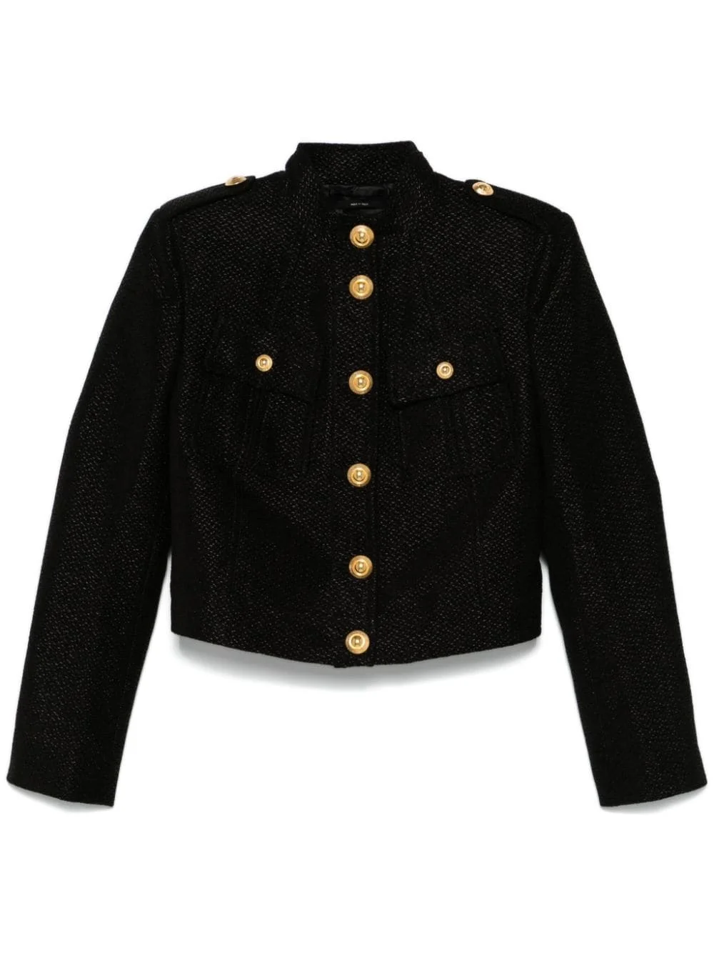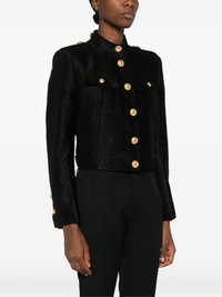 tweed jacket Highlights - Black - Tweed - High-shine threading - Front button fastening - Stand-up collar - Epaulettes - Shoulder pads - Long sleeves - Buttoned cuffs - Two chest flap pockets - Waist tabs - Strap detailing to the rear - Full lining - Straight hem - Cropped Made in Italy Composition Outer: Lambskin 100%, Viscose 84%, Polyester 12%, Silk 4% Lining: Cotton 56%, Viscose 44% SIZE & FIT Model measurements Height 5 ft 10 in(1.78 m) Bust/Chest 31.49 in(80 cm) Hips 37 in(94 cm) Waist 23.62 in(60 cm) FittingInformation Designed for a slim fit that sits just away from the body offering a close yet comfortable fit The internal shoulder pads offer a structured shape Made from a midweight non-stretch fabric