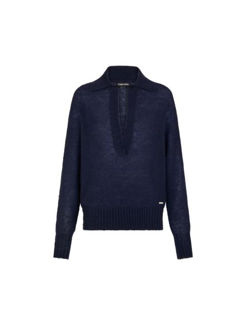 PRODUCT NO: MAK1391-YAX921 A TOM FORD wardrobe signature in seamless cashmere silk—elevated by a daring V-neckline and subtle metallic plaque detail. Composition: 74% cashmere, 26% silk. Made in Italy.