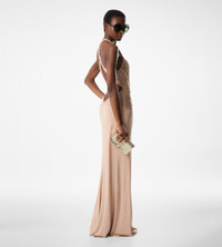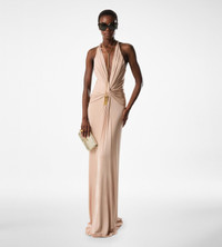 - EVENING DRESS - DEEP V-NECK - TWISTED CRISS-CROSS STRAPS - CENTRE FRONT KNOT DETAIL AND DRAPING EFFECT - GATHERED PLEATS DETAIL ON THE CENTRE FRONT AND BACK - INVISIBLE SIDE ZIP - CRAFTED IN FLUID KNITTED VISCOSE STRETCH JERSEY - 97% VISCOSE 3% ELASTANE - LINING: 96% VISCOSE 4% ELASTANE