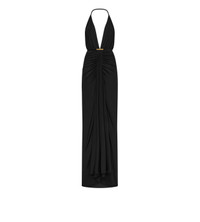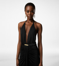- V-NECK EVENING DRESS , - TF SIGNATURE METAL HARDWARE AT THE END OF THE NECKLINE - FLOOR LENGTH - DRAPED WATERFALL CENTRE FRONT DETAIL - CRAFTED IN FLUID KNITTED VISCOSE STRETCH JERSEY - 97% VISCOSE 3% ELASTANE , - MADE IN ITALY