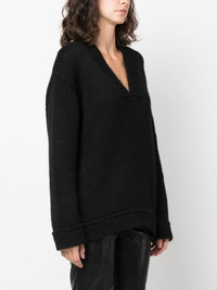 V-neck pullover jumper Highlights - Black - Alpaca wool-blend - Knitted construction - V-neck - Long sleeves - Ribbed cuffs and hem - Straight hem Made in Italy Composition Alpaca 68%, Polyamide 22%, Wool 10% SIZE & FIT Model measurements Height 5 ft 9 in(1.76 m) Bust/Chest 33.07 in(84 cm) Hips 34.64 in(88 cm) Waist 25.59 in(65 cm) FittingInformation Designed to be unstructured, offering a loose fit throughout Made with a midweight knit, this piece offers some stretch This piece fits true to size – take your usual size Measurement SLEEVE LENGTH 17.71 in(45 cm) LENGTH 23.62 in(60 cm) BUST 46.45 in(118 cm)