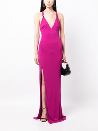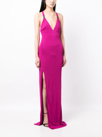 V-neck side-slit maxi dress Tom Ford showcases its minimalist values through tonal design and elegant silhouettes, as seen with this fuchsia pink maxi dress. Two suspender clips embellish the cross-over shoulder straps, while the plunging V-neckline is mirrored by a low V-back and thigh-high side slit. Highlights - Fuchsia pink - Plunging v-neck - Suspender clips - Crossover shoulder straps - Sleeveless - Fitted waistline - V-back - Side slit - Straight hem - Floor-length Made in Italy Composition Outer: Viscose 100% Lining: Polyamide 80%, Elastane 20% SIZE & FIT Model measurements Height 5 ft 10 in(1.77 m) Bust/Chest 28.74 in(73 cm) Hips 35.82 in(91 cm) Waist 24.4 in(62 cm) FittingInformation Designed for a slim fit that sits just away from the body offering a close yet comfortable fit Made from a midweight stretch fabric, this piece offers elasticity and flexibility when worn This piece fits true to size – take your usual size Washing instructions Dry Clean Only