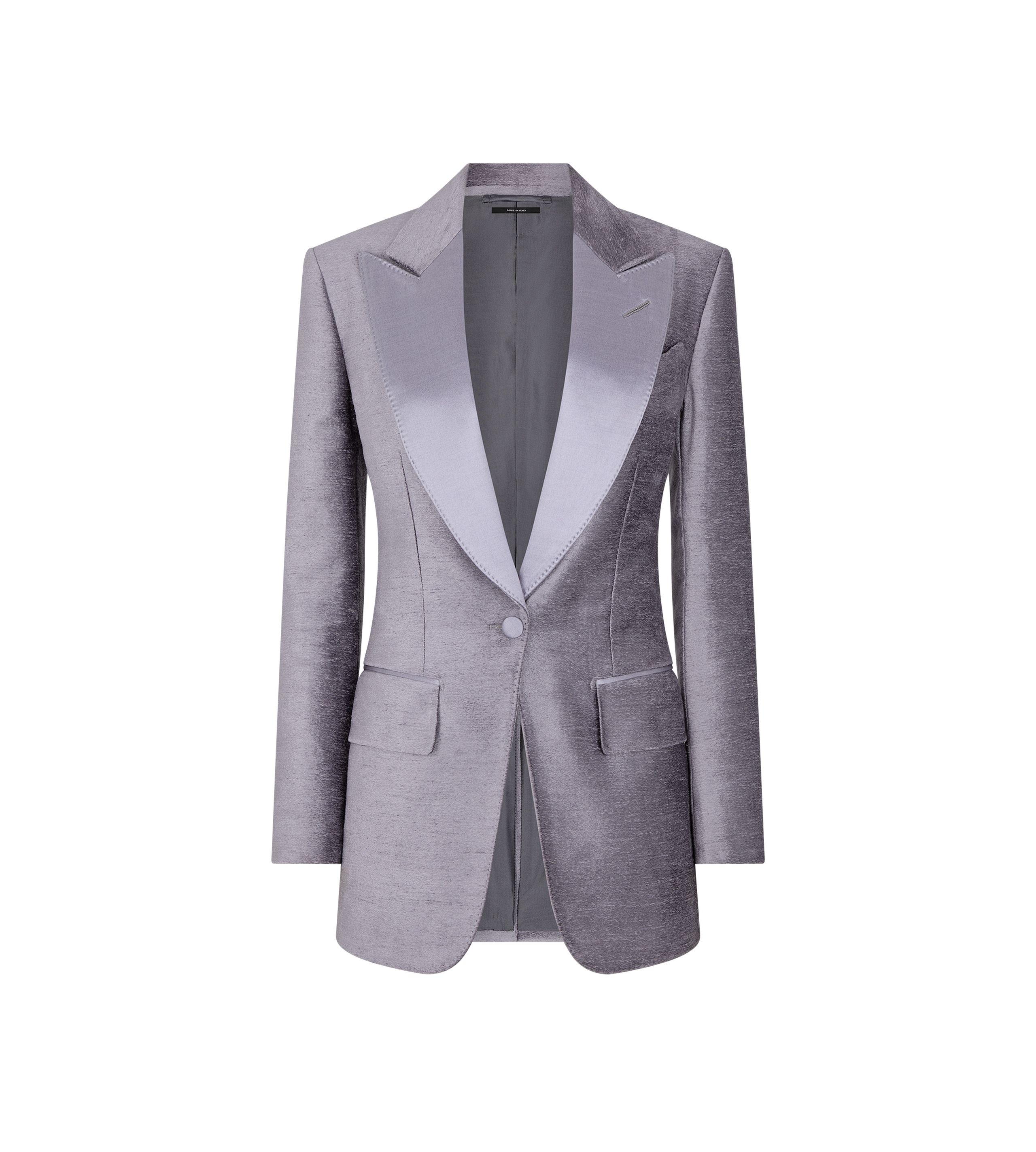 - SINGLE BREASTED TUXEDO PEAK LAPEL JACKET - BARCHETTA CHEST POCKET - HAND-MADE LAPEL BUTTONHOLE - FLAP POCKETS - SATIN-TRIMMED DETAILING ON FRONT POCKETS AND LAPELS - 5 KISSING CUFF BUTTONS - TOM FORD DESIGNS FEATURE A LONGER FIRST FINAL BUTTONHOLE ON CUFF - WITH INTERNAL POCKETS - SINGLE VENT - COVERED BUTTONS - AMF STITCHING - FULLY LINED - FULLY CANVASSED - CRAFTED IN VISCOSE BLEND VELOUR - 51% VISCOSE 36% COTTON 13% NYLON
