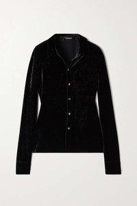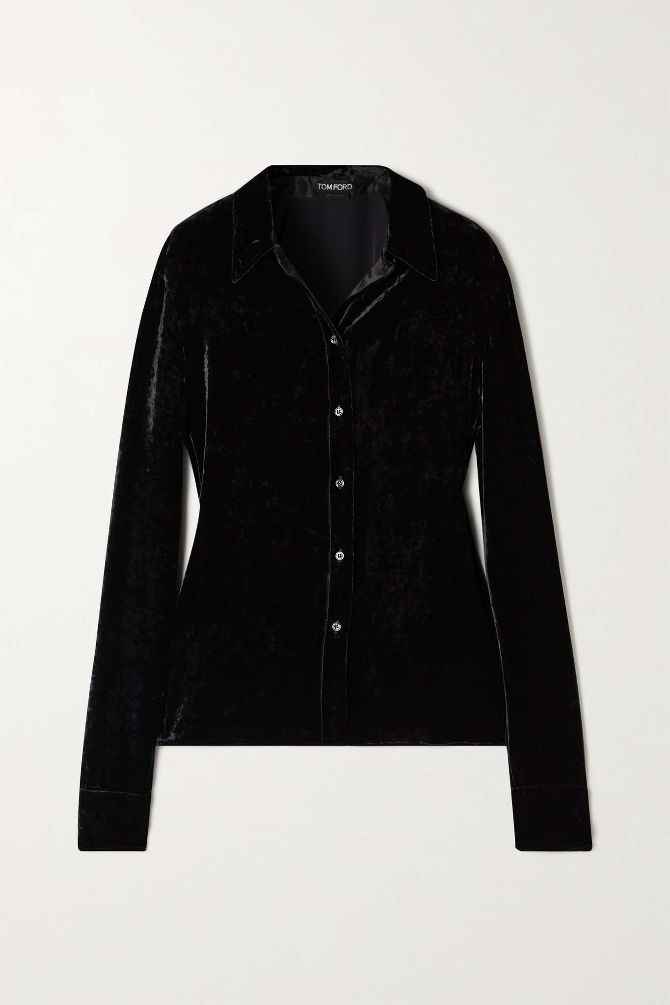 EDITORS'NOTES TOM FORD has mastered the art of fit and fabric with this plush velvet shirt. Relaxed and super soft, it neatly fastens with mother-of-pearl buttons and has a silk-lined collar and cuffs. Tuck yours into pants. SIZE & FIT - Fits true to size, take your normal size - Designed for a slightly loose fit - Mid-weight, non-stretchy fabric - Model is 177cm/ 5'10" and is wearing an IT 40 DETAILS & CARE - Black velvet - Button fastenings through front - Dry clean - Mother-of-pearl: Indonesia