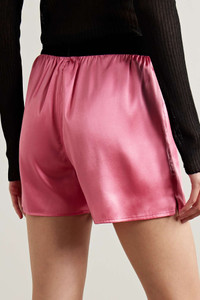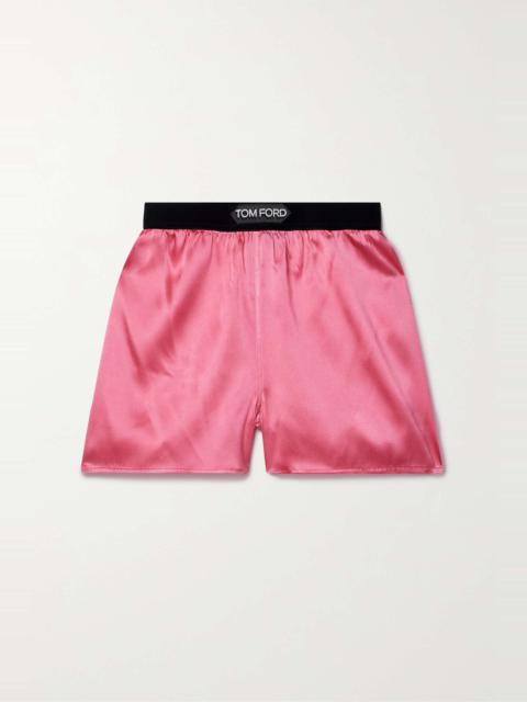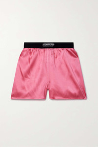 EDITORS'NOTES TOM FORD's shorts are modeled on men's boxer styles. They've been made in Italy from silk-blend satin and have a flexible velvet-trimmed waistband featuring the label's logo in white lettering. SIZE & FIT - Fits true to size, take your normal size - High-rise, cut for a slightly loose fit - Elasticated at the waist for a flexible fit - Lightweight, fluid, non-stretchy fabric - Model is 180cm/ 5’11” and is wearing a size Small DETAILS & CARE - Bubblegum silk-blend satin, black-velvet - Pull on - 94% silk, 6% elastane; trim: 90% polyamide, 10% elastane - Dry clean - Designer color: Pink Carnation