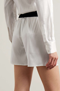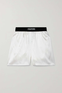 EDITORS'NOTES TOM FORD's shorts are modeled on men's boxer styles. They've been made in Italy from silk-blend satin and have a flexible velvet-trimmed waistband featuring the label's logo in white lettering. SIZE & FIT - Fits true to size, take your normal size - High-rise, cut for a slightly loose fit - Elasticated at the waist for a flexible fit - Lightweight, fluid, non-stretchy fabric - Model is 180cm/ 5’11” and is wearing a size Small DETAILS & CARE - Ecru silk-blend satin, black-velvet - Pull on - 94% silk, 6% elastane; trim: 90% polyamide, 10% elastane - Dry clean
