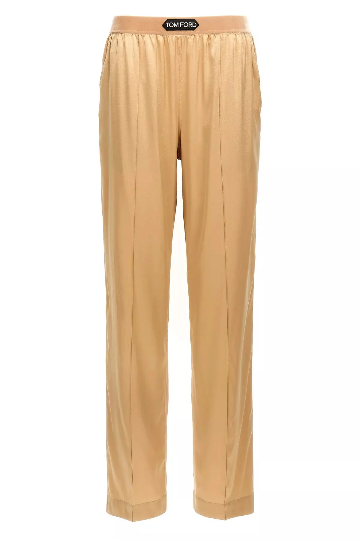 cod. PAW397FAX881JB022 Stretch silk pants, pajama model, straight leg, velvet elastic with logo patch at the waist, pockets. Color: Beige Size & Fit: true to size fit Composition: 94% silk 6% elastane Made in: Italy