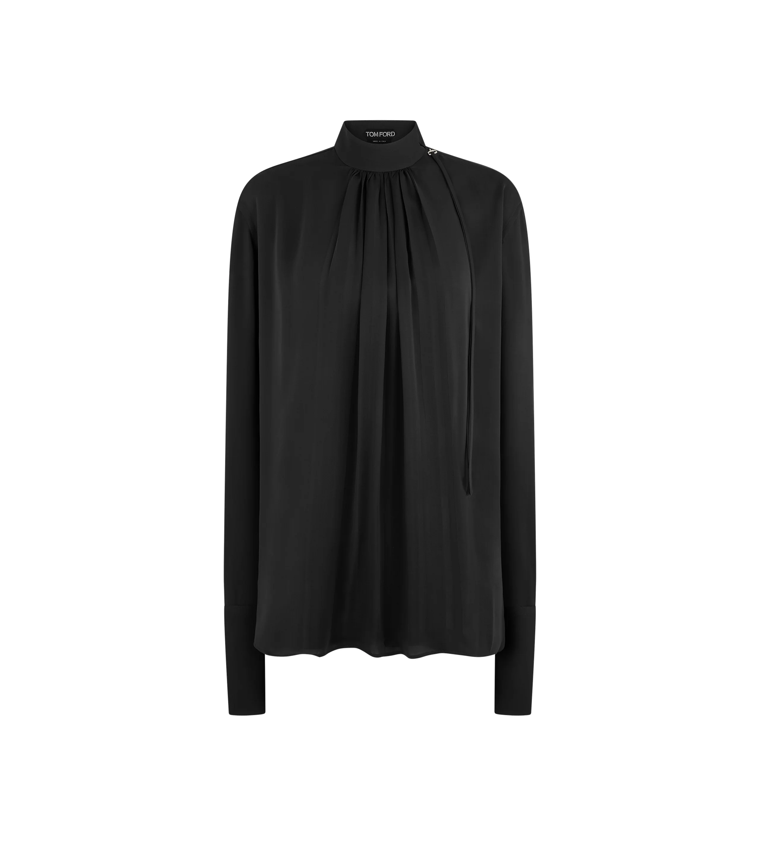 - LONG SLEEVE GATHERED PLISSE BLOUSE - STAND COLLAR - INVISIBLE ZIP INSERTED ON THE SHOULDER LINE FROM THE ARMHOLE TO THE COLLAR - PLISSE’ CONSTRUCTION WITH SOFT GATHERING AT THE FRONT - SELF FABRIC ZIP PULLER DETAIL - SELF COVERED BUTTONS FOR CUFFS - CRAFTED IN WASHED SILK GEORGETTE - 100% SILK