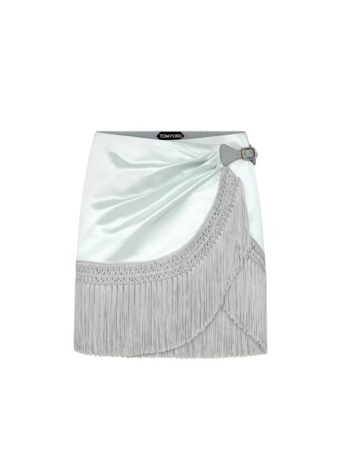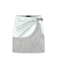 - WRAP MINI SKIRT WITH LEATHER DETAIL AND FRINGES - TONAL LEATHER BELT WITH EDGE DYE - TF SIGNATURE METAL BUCKLE CLOSURE - MACRAME’ FRINGES APPLIED ON THE BOTTOM OF THE SKIRT - INTERNAL MOTHER OF PEARL BUTTON - CRAFTED IN COTTON AND SILK DUCHESSE - 100% SILK LINING - 77% COTTON 23% SILK