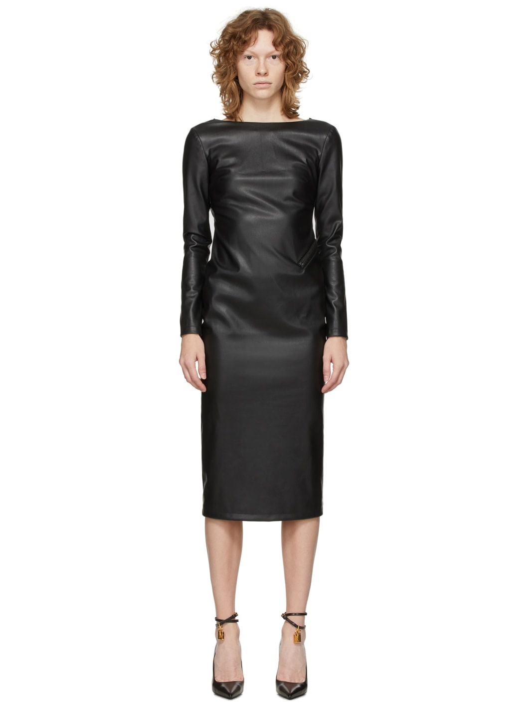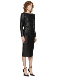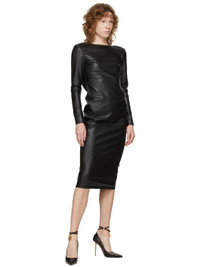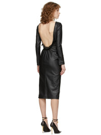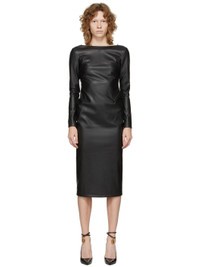Long sleeve stretch faux-leather mid-length dress in black. Scoop neck collar. Darts at chest. Zippered vent at cuffs. Zip closure at side-seam and back. Open back. Full silk lining. Gunmetal-tone hardware. Supplier color: Black Body: 52% polyester, 45% polyurethane, 3% elastane. Lining: 94% silk, 6% elastane.