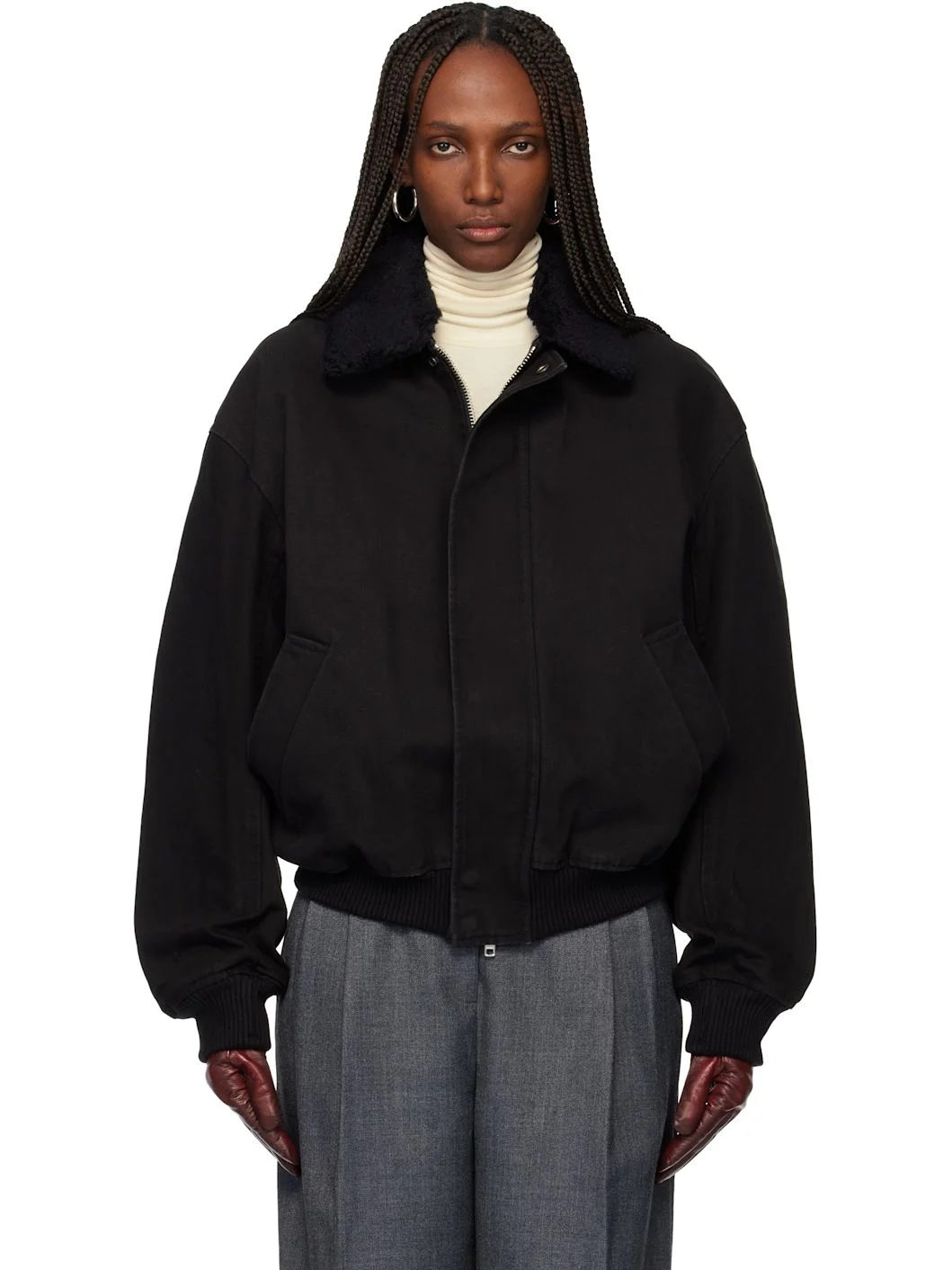 Cotton canvas bomber jacket. · Detachable fleece trim at spread collar · Two-way zip closure with press-stud placket · Welt pockets at front · Rib-knit hem and cuffs · Welt pocket at interior · Full quilted satin lining Supplier color: Black Body: 100% cotton. Trim: 70% acrylic, 30% wool. Lining: 100% polyester. Made in South Korea 252251F058001