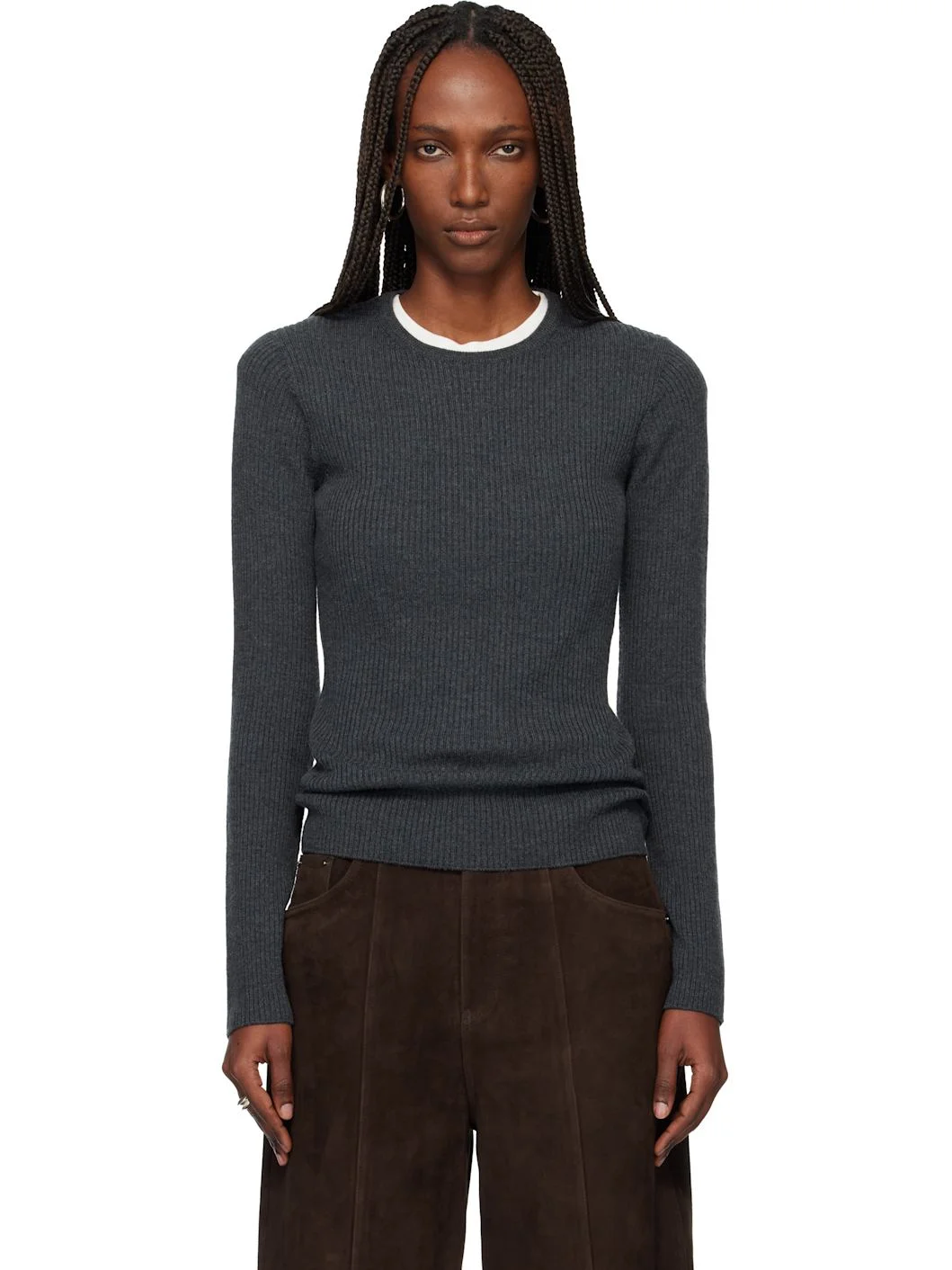 Rib-knit wool sweater. Crewneck. Supplier color: Charcoal 100% wool. Made in South Korea 252251F096003