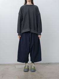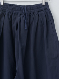 The Baker Trouser is a cropped, voluminous trouser with front pleats and deep turned-up cuffs. The fine cotton canvas is midweight and smooth, featuring a deep garment dye. Details include a low back patch pocket, hidden side pockets, and a fully elasticated waist with an inner drawstring for adjustment. - Made in Portugal - 100% Cotton - Available in Fine Canvas Ink and Fine Canvas Cardamom - The model is 5'8"/173cm and wears size S