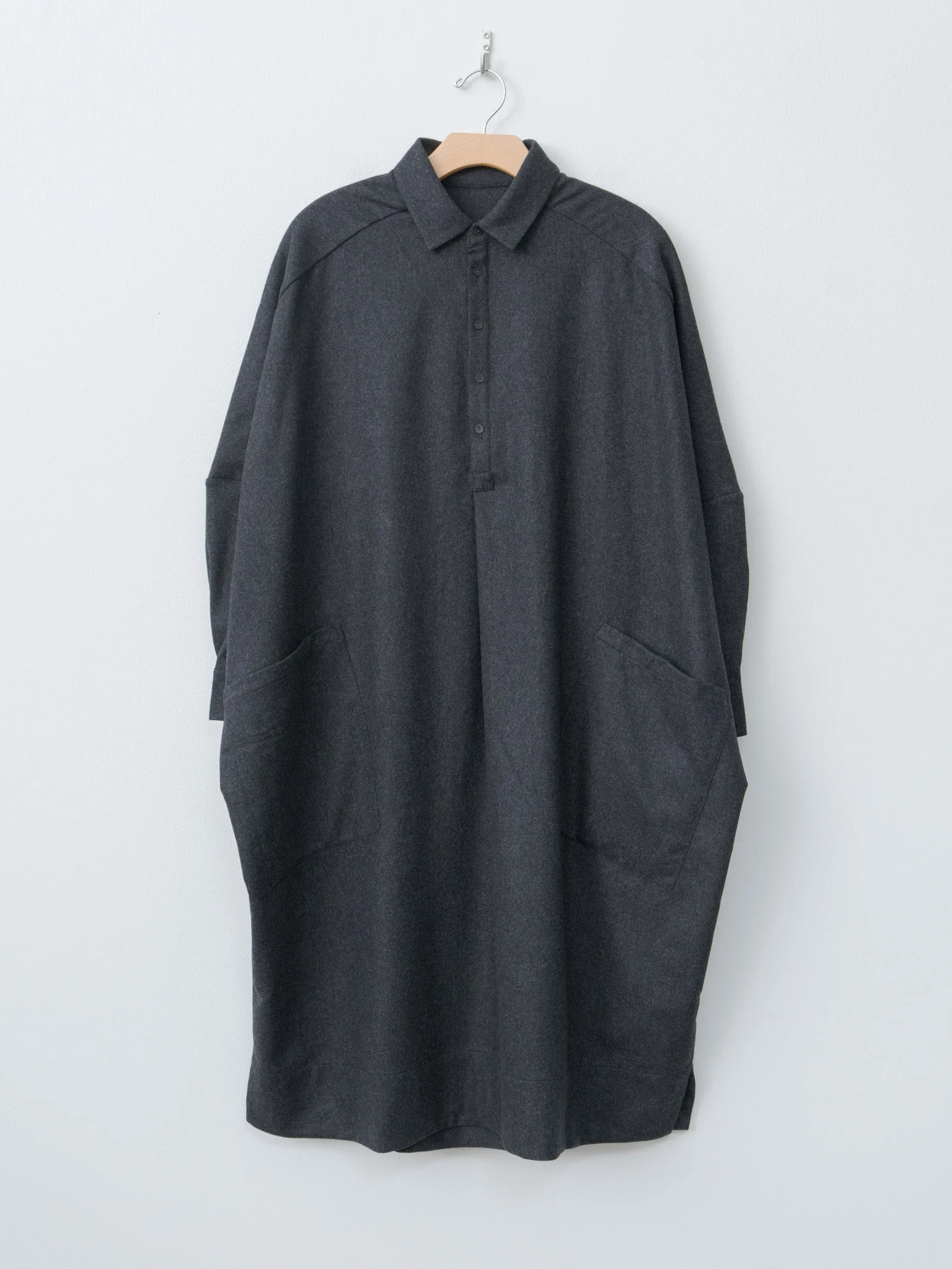 The Framer Dress is a knee-length pullover dress with a shirt-style opening to the waist and delicate button fastening. It is crafted from a soft wool-cashmere flannel blend in charcoal. The dress features dropped armholes, tilted patch pockets at the front, side slits at the hem, and a crossover pleat through the low back yoke panel. Relaxed fit. - Made in Portugal - 90% Virgin Wool, 10% Cashmere - Available in Wool Cash Flannel Charcoal - The model is 5'8"/172.7cm and wears size 1/S