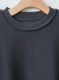 This sweatshirt is inspired by the mechanic who forever stains their jumpers and turns them inside out to extend the life of the jumper. This sculptural sweatshirt features a loopback twill outer with an inside out feel, overlayed seams on the collar and hem rib, external seams on the sleeves, a side split hem, and an embroidered logo patch on the back. Relaxed, oversized fit. - Made in Portugal - 100% Organic Cotton - Available in Loopback Twill Charcoal - The model is 5'8"/172.7cm and wears size S