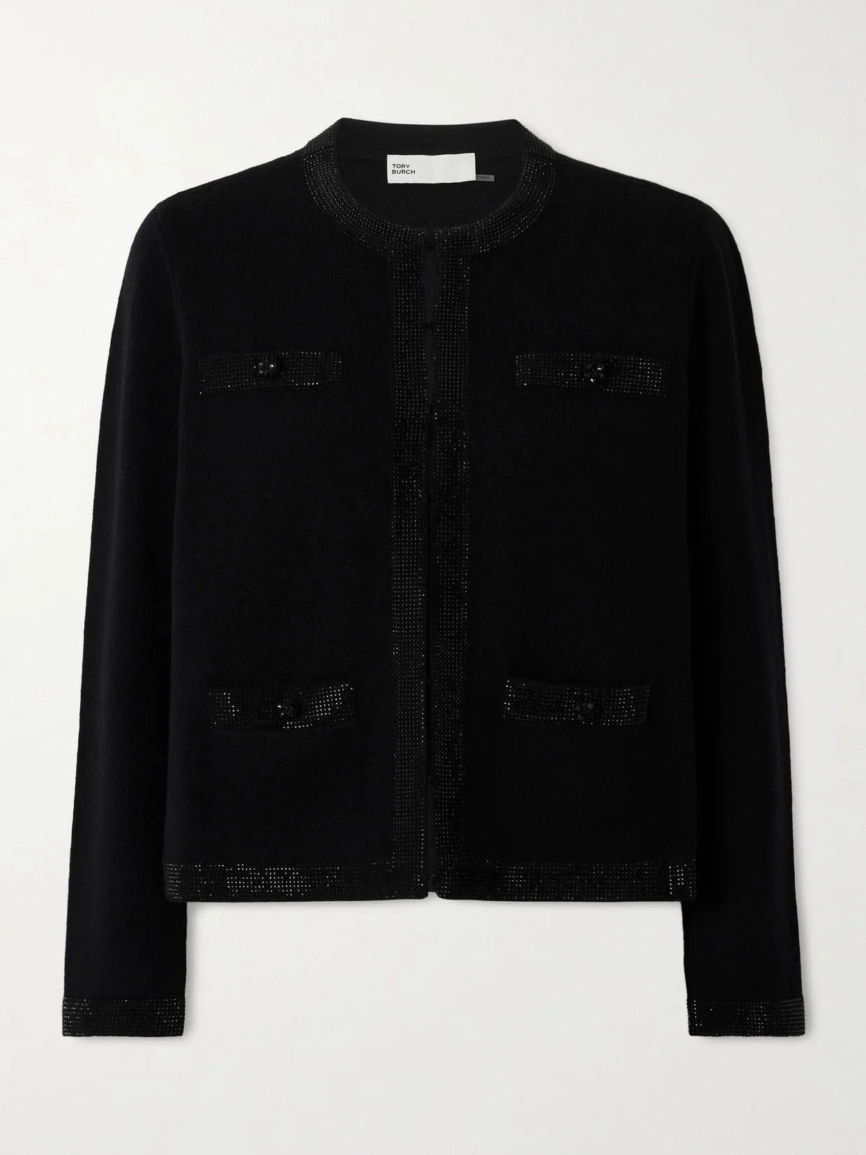 Tory Burch's 'Kendra' cardigan is just perfect for holiday parties. Knitted from wool-blend in a chic, collarless profile, it's embellished with glinting crystals at the edges and decorative buttons on the pockets. Wear yours with tailoring or over a slip dress.