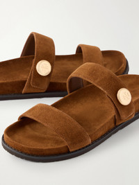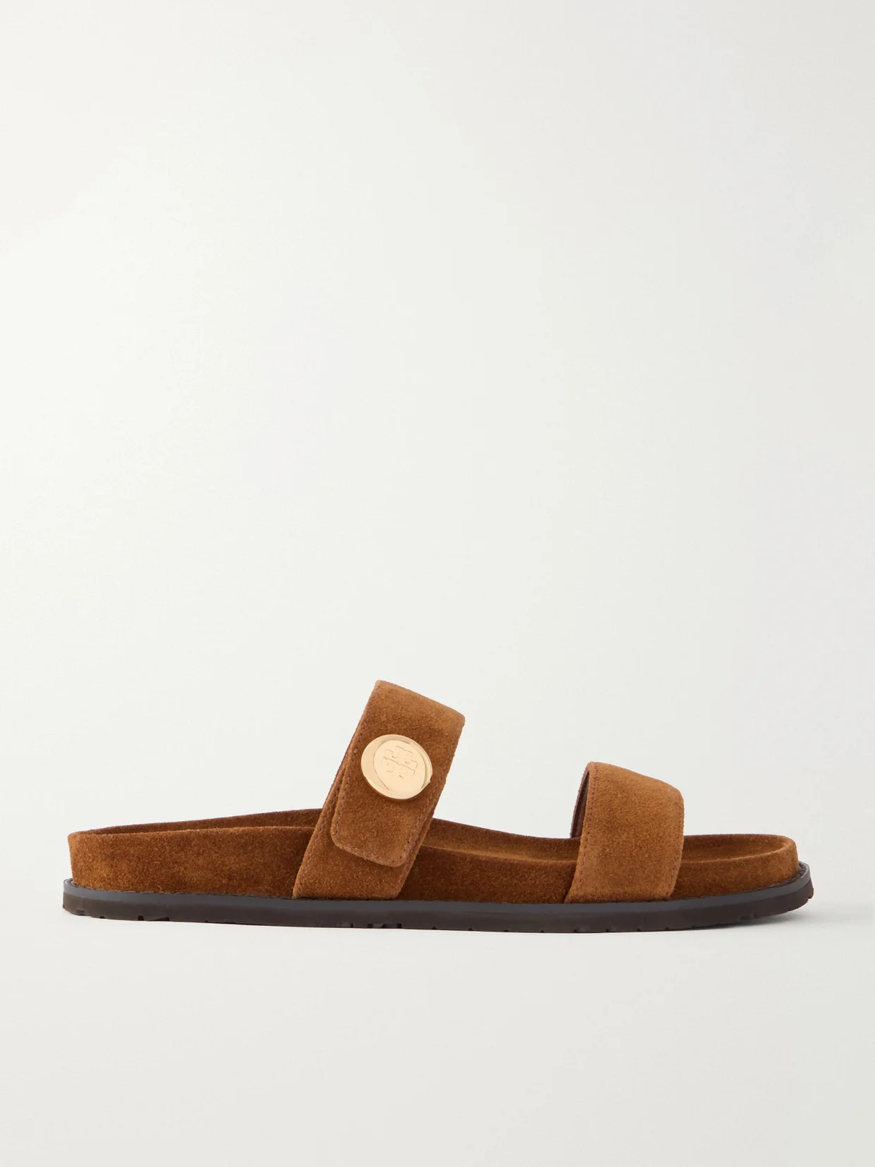 Tory Burch's 'Romy' slides balance comfort with the label's signature refinement. Crafted from supple suede, they're detailed with a gold-tone emblem at one of the straps.