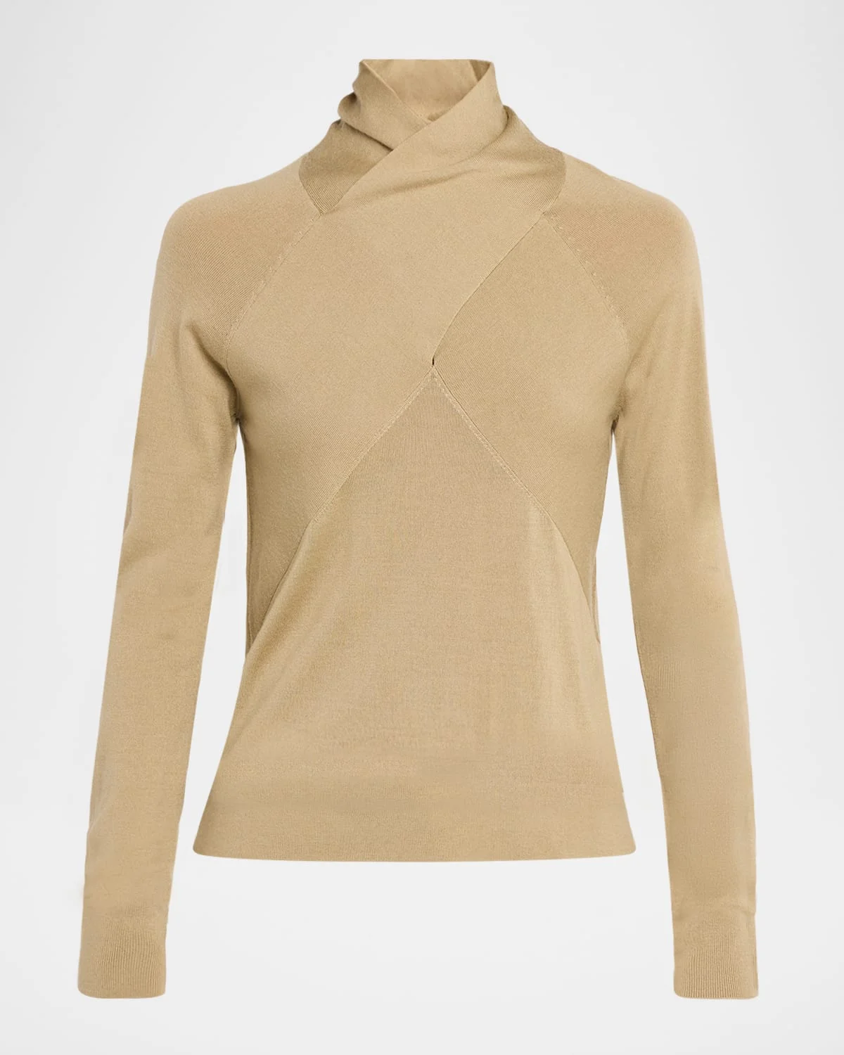 Knit from cozy merino wool, this lightweight layer by Toteme features a unique crossover neckline and raglancut sleeves High neckline Long sleeves Relaxed fit Hip length Pullover style Merino wool Hand wash Imported