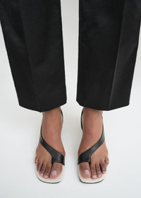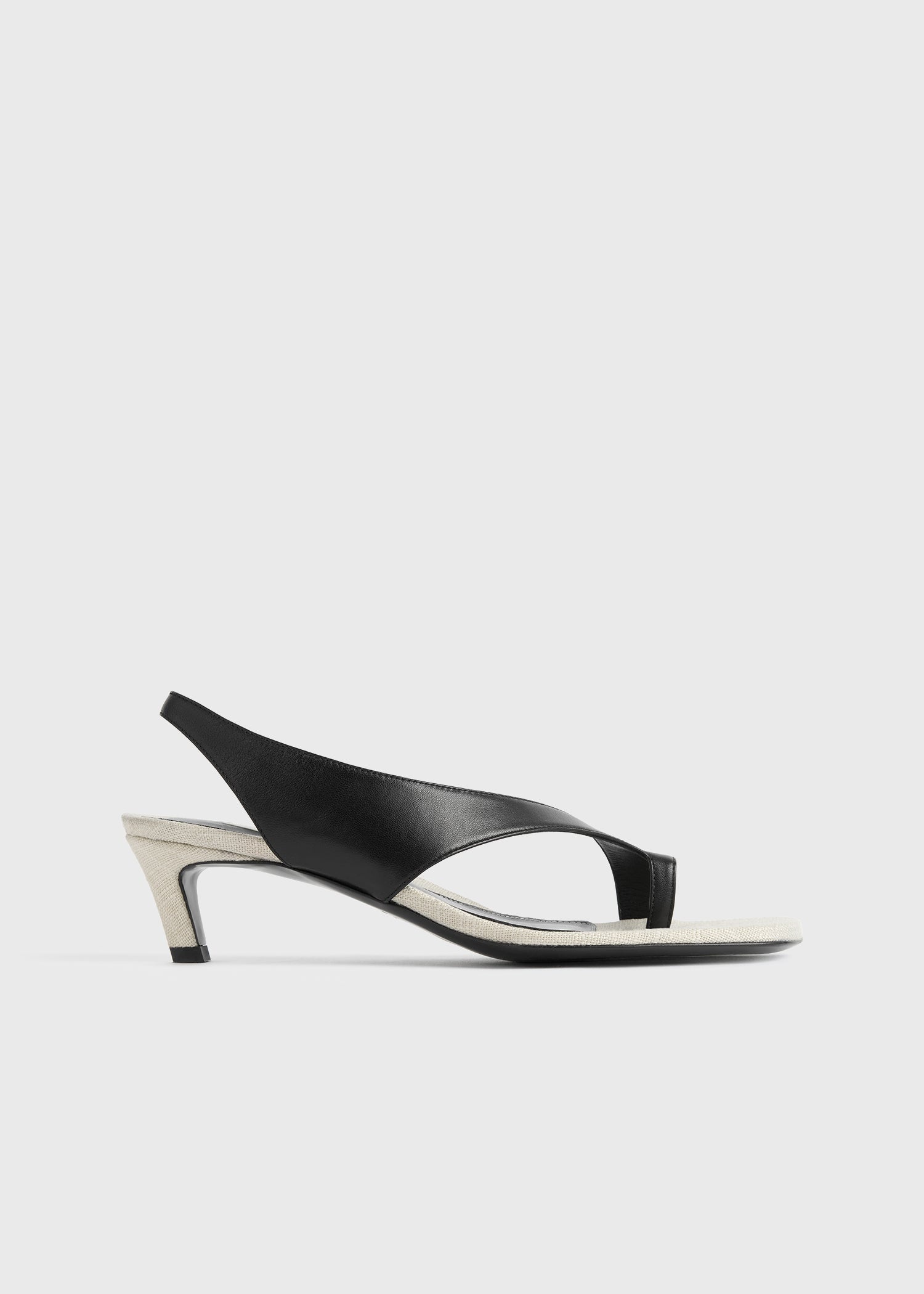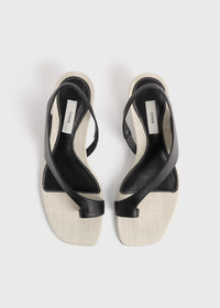 TOTEME sandals hugging the big toe with a thong connected to an elasticated slingback through sculptural craftsmanship. They are made by expert shoemakers from black leather and set on a slanted 40mm heel. Note how the sand canvas trims enhance their artisanal appeal. Details & Fit - Black/Sand - Black leather upper, elasticated slingback - Leather and canvas insole - Leather sole - 100% lamb leather; lining: 100% sheep leather; sole: 100% cow leather - Care instructions and dust bag included - Style number 252-WAS0201-LE0104 - Average heel height 40mm/1.6" proportional to shoe size - True to size. If you have narrow feet, consider taking a smaller size for a foot-hugging fit