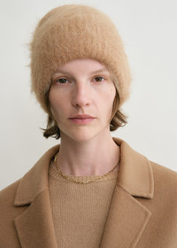 TOTEME beanie hat imagined as a warm winter set complete with the Boxy alpaca knit. It Is knitted from a fuzzy alpaca blend with a melange effect and can be worn with the edge folded or extended. Details & Fit - Camel melange - 78% alpaca, 19% polyamide recycled, 3% elastane - Cool hand wash - Style number 244-WSH1524-YA0106